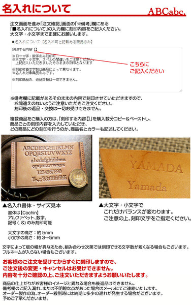 一点ずつ職人さんによる刻印で、出来る限り丁寧な仕上がりを心がけておりますが、手作業による天然皮革への刻印ため、スペルの絶対水平はお約束しておりません。