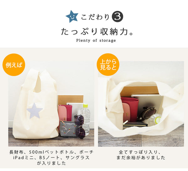 | コメント | コンビニ行く際やちょっとしたお買い物に便利なエコバッグ★ かわいい星のモチーフ 名入れもできるので、ちょっとしたプレゼントにもお勧め! |