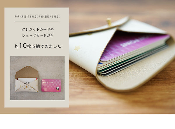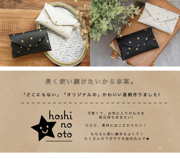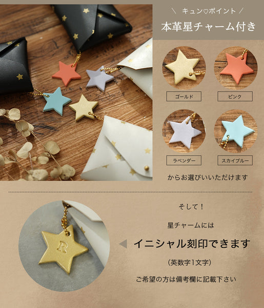 | 素材 | 本体:牛革(革の厚さ1.3mm・かさばらない厚みに薄く剥いています) ※裏地なし 星チャーム:牛革(厚さ2.5~3.0mm) ※裏地なし ※金具はゴールド色です |