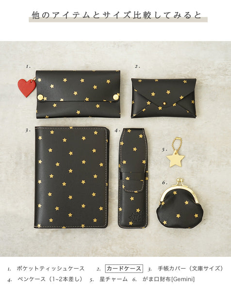| 機能 | 名刺だと約20枚、カードだと約10枚収納可能 ギボシボタンで開閉 星チャーム1つ付属(4色からお選びいただけます) |
