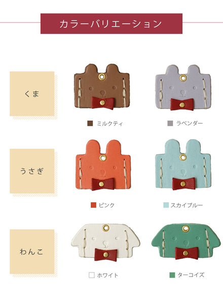 | コメント | かわいい 本革 キーカバー くま・うさぎ・いぬ にっこりほほえみ顔に おしゃれな蝶ネクタイ♪ お出かけスタイルのアニマルたち★ 革はヌメ革(姫路レザー)を使用しています ギフト・プレゼント・プチギフト におすすめ♪ |