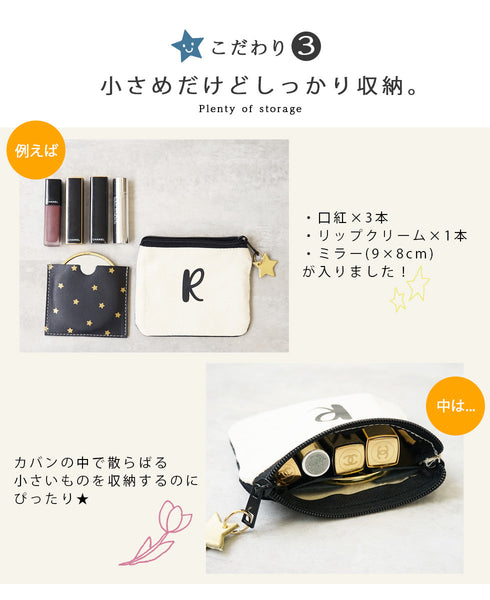 | コメント | ティッシュケースが付いたポーチ★ 一般的なサイズのティッシュはもちろん、リップや鍵などの小物も入るファスナー付のポーチです! ティッシュが取り出しやすいよう、しなやかなライトキャンバスの生地を使用しており、表面と裏面で生地色の異なるバイカラー仕様などデザインにもこだわった商品です。 取っ手は 本革 の星★ ワンポイント に かわいい です♪ おしゃれ な バイカラー ちょっとしたプレゼント・ギフトにもお勧め! イニシャル は アルファベット(大文字)or数字 から1文字選べます! |