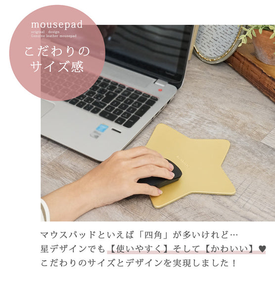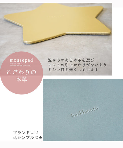 | コメント | 今までなかった!星のかたちの マウスパッド★ かわいい オリジナルデザインです! テレワークや外出先で、オフィスで使いやすいサイズ感 素材もこだわり 本革 マウスパッドです すべて手作りの日本製 1つずつ丁寧に作っています 名入れもできるのでギフト・プレゼントにも♪ ネーム入りで特別感! 記念品や送別品にもお勧めです。 |