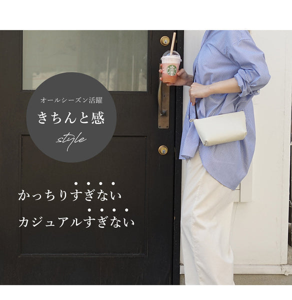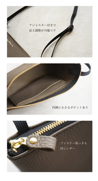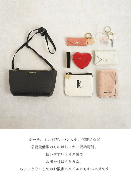 | サイズ | bag本体:H11cm・D5cm 底:W16.5・D6cm ファスナー開口部:20cm ストラップ紐:全長約120cm(長さ調整機能付き) ※個体差あり |