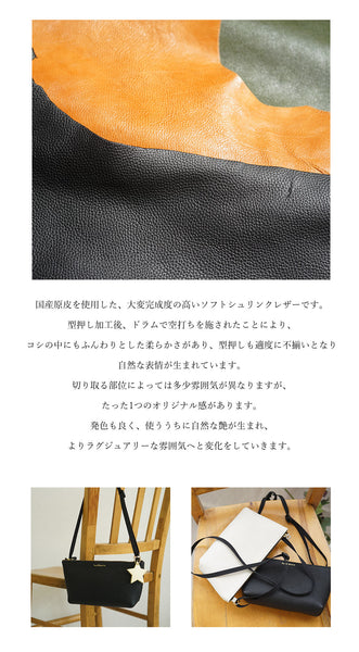 ・本革は天然素材のため、動物が持っていた傷やシワがあります。また表面加工を行っていないため、製造工程でできた小さい傷がある場合があります。