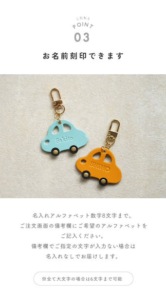 | コメント | かわいい くるま のチャーム コーディネート の ワンポイント となる大きさ! バッグやポーチにつけるとかわいい☆ 取り付け便利な金具・チェーン付きです! 大人がつけても ◎ 名入れ可能なので、子どものカバン用に ギフト や プレゼント にもお勧めです! |
