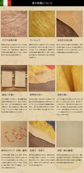 ・本革は天然素材のため、動物が持っていた傷やシワがあります。また表面加工を行っていないため、製造工程でできた小さい傷がある場合があります。