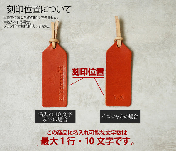 一点ずつ職人さんによる刻印で、出来る限り丁寧な仕上がりを心がけておりますが、手作業による天然皮革への刻印ため、スペルの絶対水平はお約束しておりません。