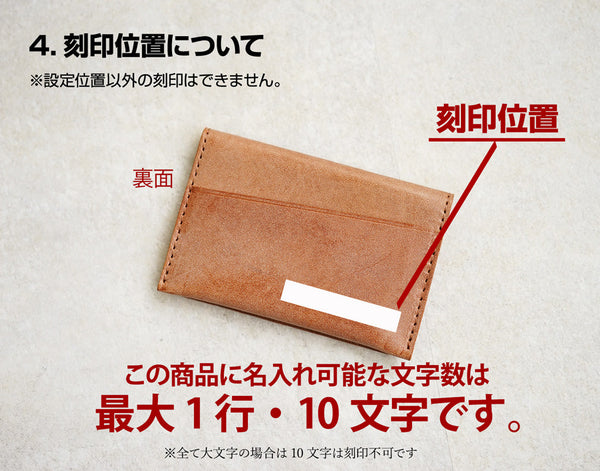 一点ずつ職人さんによる刻印で、出来る限り丁寧な仕上がりを心がけておりますが、手作業による天然皮革への刻印ため、スペルの絶対水平はお約束しておりません。