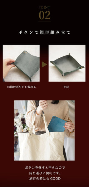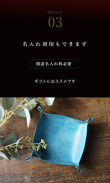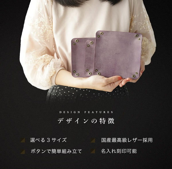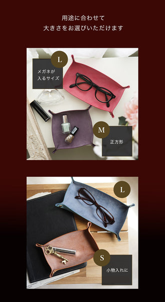 | コメント | 選べる3サイズ☆ アクセサリーなどの小物入れから、メガネが入るサイズまでをご用意! ボタンで簡単に組み立て可能! ボタンを外すと平になるので、旅行先など持ち運びにも便利です。 植物タンニンなめしの ヌメ革 で、しっとり手に馴染む 日本製 のレザー エイジングも素晴らしく 育て甲斐がある革です。 名入れ可能なので、ギフト・プレゼントにもお勧めです! カップル・夫婦 記念日や誕生日にも、同僚への送別品や餞別品、周年記念品・ノベルティとしてもお勧め。 **** [bateau-バトー] という名称について **** bateauはフランス語で ”船”という意味があります。 四隅を留めたデザインが船首に見えたこと、物を載せるところが 船に見えたことなどから、 bateauと名付けました。 |