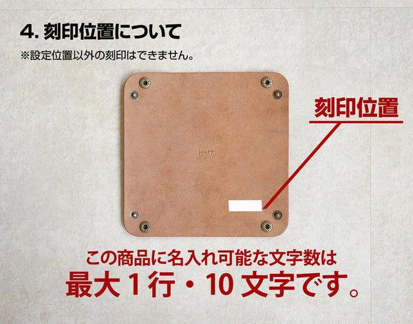 一点ずつ職人さんによる刻印で、出来る限り丁寧な仕上がりを心がけておりますが、手作業による天然皮革への刻印ため、スペルの絶対水平はお約束しておりません。