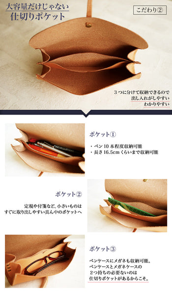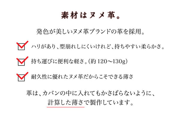 | 素材 | 素材:牛革(ヌメ革)厚さ2.0mm 機能:内側にポケットの仕切りあり |