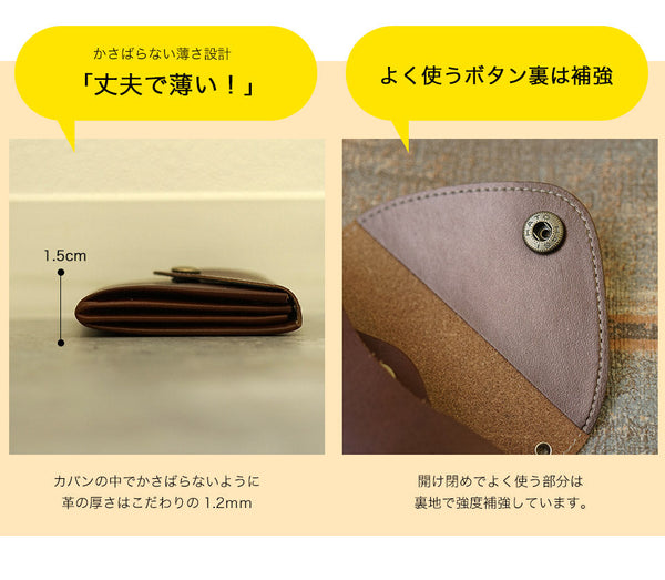 | コメント | 栃木レザー使用の コンパクト財布 手のひらサイズ・薄い 持ち運びに便利! お札は折らずに入れられる! カードも収納可能! 名入れも可能でギフトにもお勧め♪ メンズ・レディース ユニセックス アイテムです |
