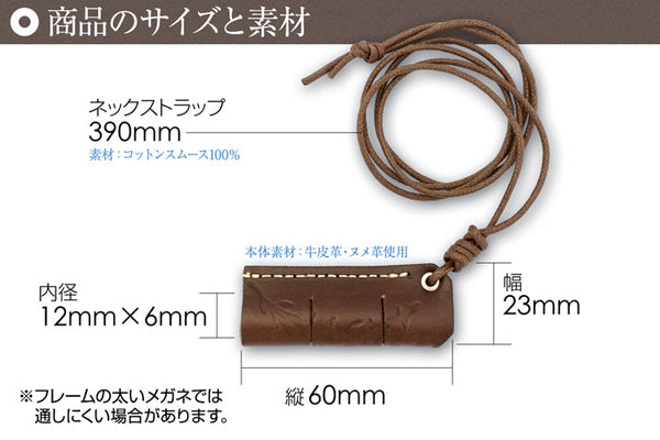 | サイズ | 本体:縦60ミリ、幅23ミリ、内径12ミリ×6ミリ ネックストラップ:390ミリ ※フレームの太いメガネは通しにくい場合があります。 |