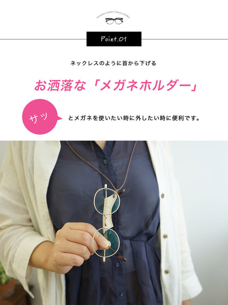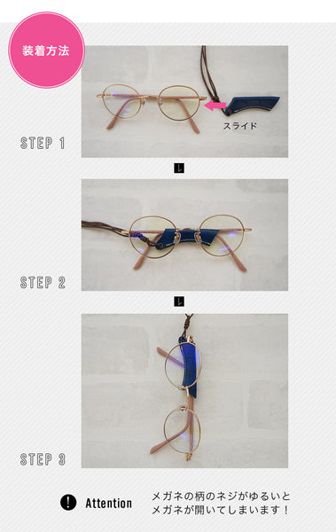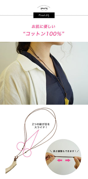 | 機能 | メガネの柄を、本体に差し込んでください。 ストラップは2つの結び目をスライドすると長さ調整が可能です。 |
