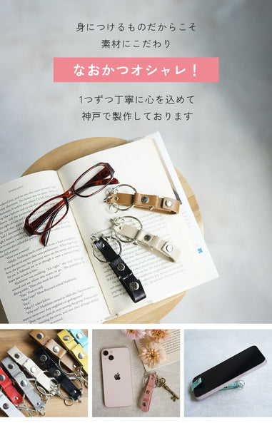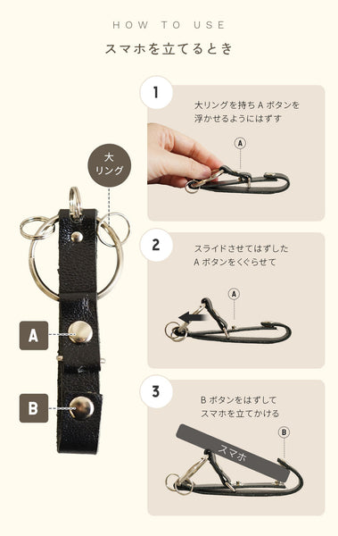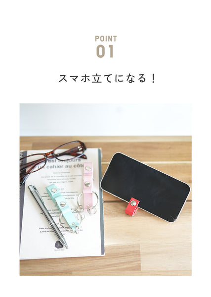 | コメント | スマホ立てになる! 本革キーホルダー☆ バッグやベルトに取り付け可能で 持ち運びにも便利です♪ 丸リング3つも付属して キーリングとしても◎ |