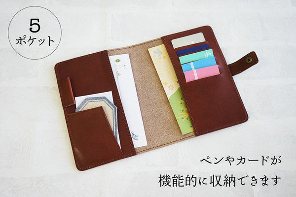 | 機能 | ・内側右にカードポケット5か所 ・内側左にポケット1か所 ・ペンホルダー1か所(小さめ) ・スナップボタンで開閉 |
