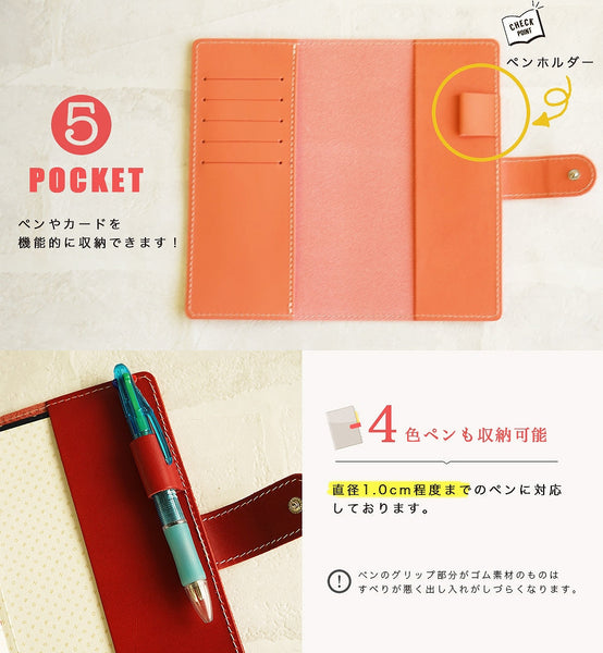 | 機能 | ・内側左にカードポケット5つ ・ペンホルダー1つ ・スナップボタンで開閉 |