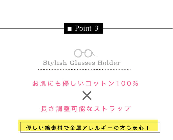| サイズ | 本体:6cm・2cm ※フレームの太いメガネは通しにくい場合があります。 ネックストラップ:全長約46cm(長さ調節機能付き) |